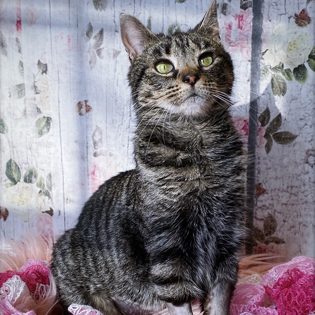 Introducing PINKY BOBTAIL! This little girl is super sweet, chill, and a tad sassy. She absolutely loves to sit on a warm lap. And it’s even better if you are brushing her. Pinky will do best in a calm, low energy home. She loves to play in her water bowl! She is a catnip hog! Pinky gets along, selectively, with other super friendly cats. One BFF kitty might work, but she would do really well as an only kitty. Pinky is a dark brown tabby, with a cute little muzzle. She lost her tail to an old injury but not only has it has healed beautifully, but she now has the most ADORBS bobtail. Pinky will be a loyal companion. Come meet her. Apply for sweet Pinky at GHHS.org.